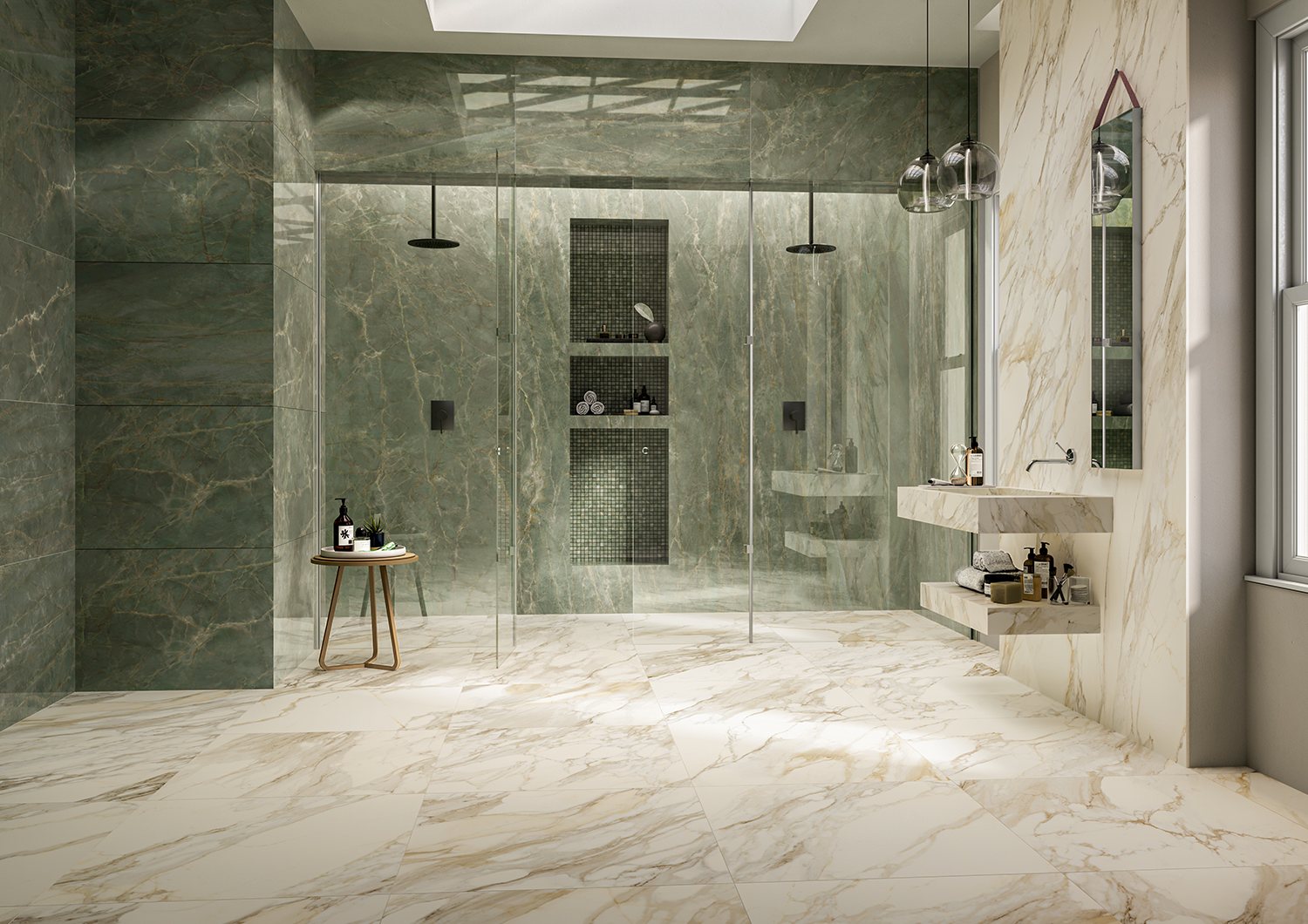 กระเบื้องพอร์ซเลนสีเขียว ผิวแมท ลวดลายมีเอกลักษณ์เฉพาะตัว ที่ผสมผสานด้วยสายแร่ทองคำที่มีความบริสุทธิ์สูง ของหินอ่อนกลุ่ม Exotic ที่พบได้ยากจากป่าลึกในประเทศบราซิล สู่แรงบันดาลใจ ในการสรรสร้างกระเบื้องที่สะท้อนถึงความ Luxury, Unique และ Dramatic ได้ ในเวลาเดียวกัน ของกระเบื้องรุ่น Anima Ever จากแบรนด์ CAESAR ที่จะช่วยรังสรรค์และเติมเต็มทุกความต้องการ ให้กับพื้นที่สุดพิเศษของคุณ