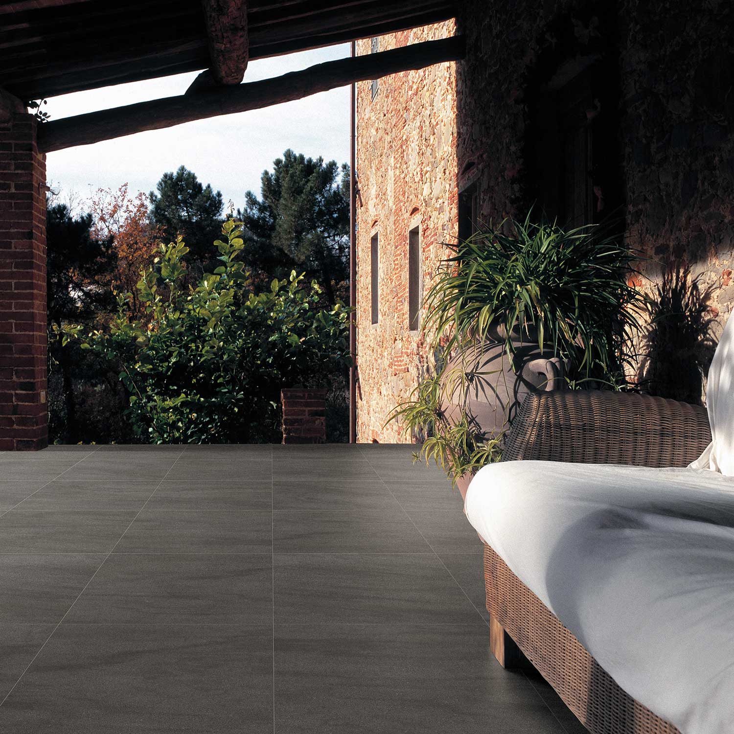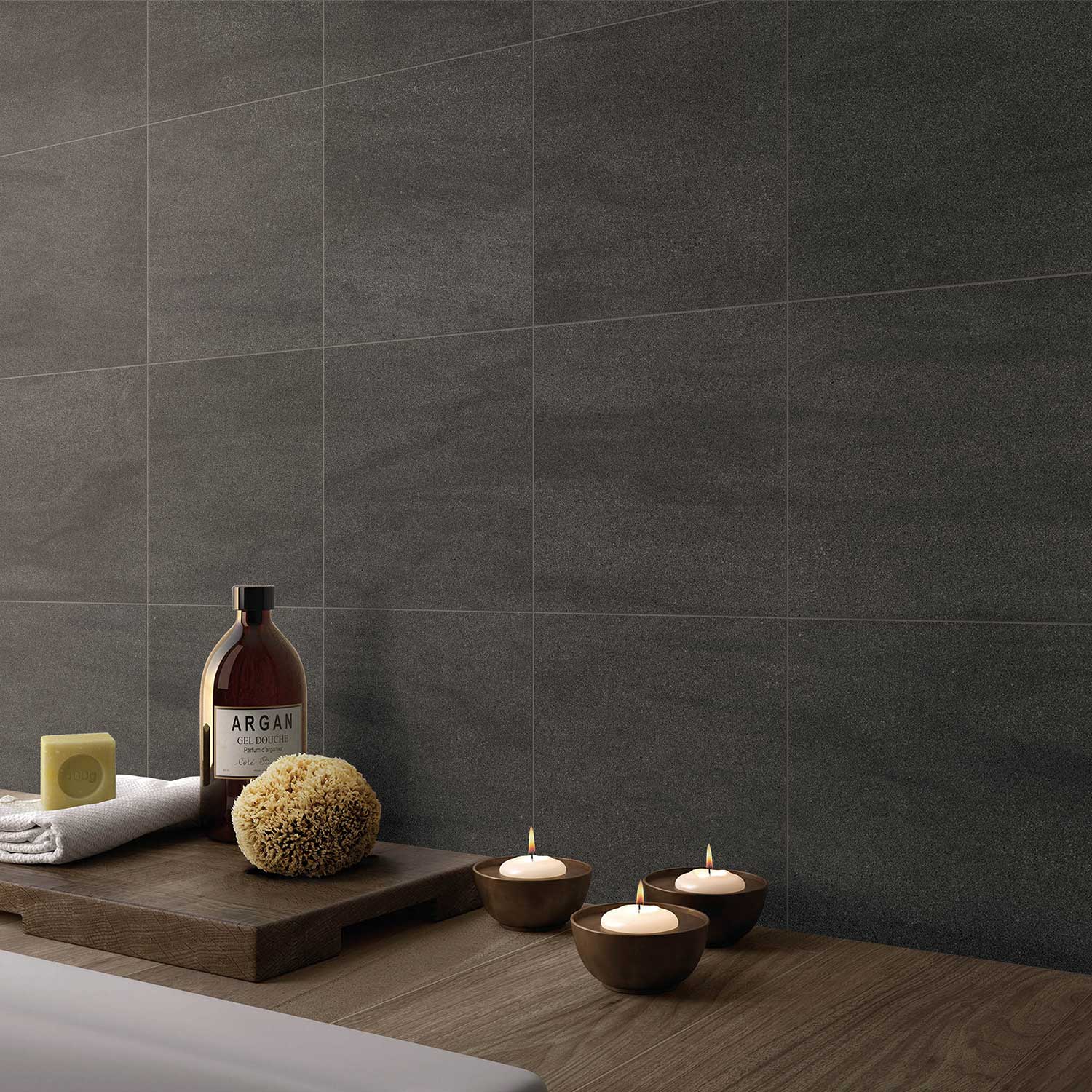 กระเบื้องพอร์ซเลนสีเทาเข้มอมดำ ผิว Microtec ขนาด 60×60 cm. ซีรีส์ Lagoon นวัตกรรมใหม่ของ WDC มีคุณสมบัติที่มีค่า 𝐑 (ค่ากันลื่น) เพิ่มขึ้นเมื่อเปียกน้ำ แต่ยังคงไว้ด้วยสัมผัสที่เนียน ละเอียด ไม่สากเท้าเมื่อแห้ง เหมาะสำหรับปูพื้นและผนัง